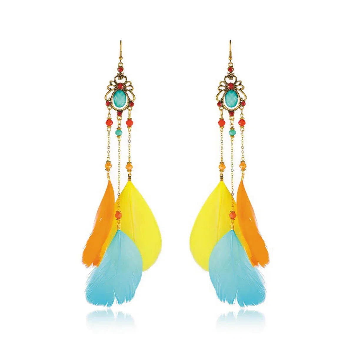 Embrace your free spirit with our vibrant Bohemian Feather Dangle Earrings. These eye-catching long statement earrings feature colorful feathers, intricate beadwork, and a striking central turquoise-like stone. Perfect for festivals, casual wear, or adding a unique touch to any outfit.