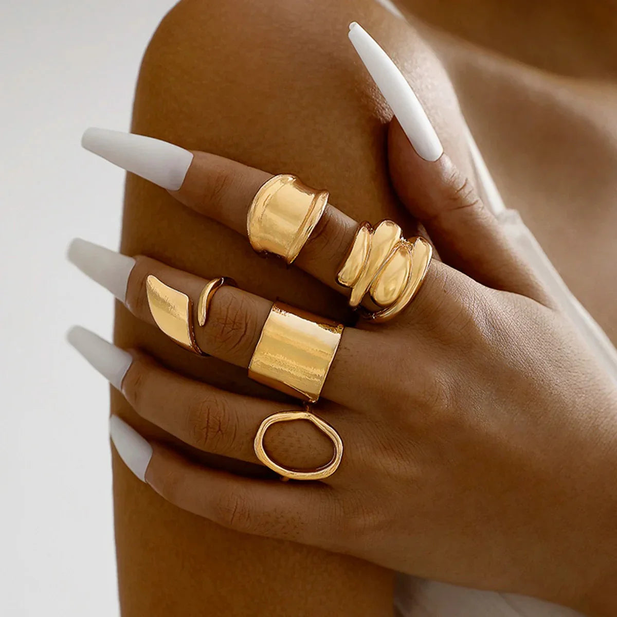 Make a bold statement with our trendy collection of chunky gold rings. This versatile set includes a variety of unique, abstract, and textured designs, perfect for stacking and mixing to create your own personalized look. Crafted with a polished gold finish, these rings are designed to be worn together for a powerful, eye-catching effect or individually for a touch of modern sophistication. Whether you're dressing up for a night out or adding a touch of glamour to your everyday style, these fashionable rings are the perfect accessory to express your unique personality.