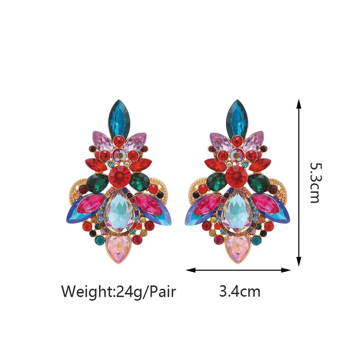 Unleash your vibrant style with these breathtaking multi-gemstone dangle earrings. Each earring is a masterpiece, adorned with an opulent array of dazzling crystals in rich shades of blue, red, pink, purple, and green. Their intricate design and brilliant sparkle ensure you'll be the center of attention at any event.