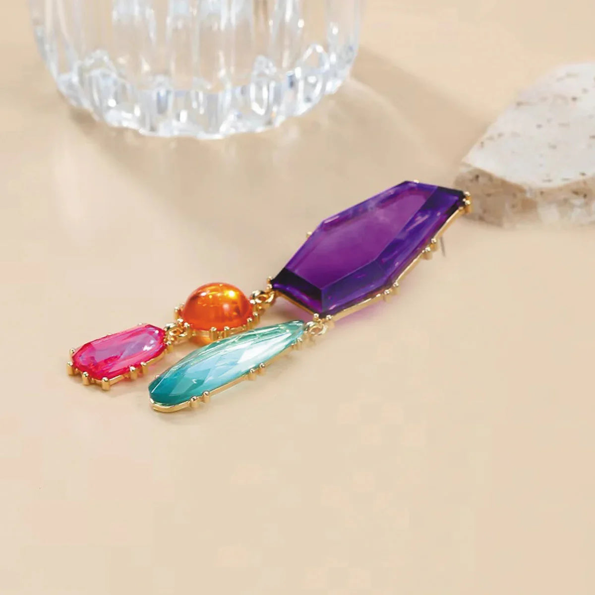 Inject vibrant personality into your look with these eye-catching geometric drop earrings. Featuring a stunning combination of rich purple, fiery orange, playful pink, and cool teal acrylic shapes, these statement earrings are designed to turn heads and spark conversations.