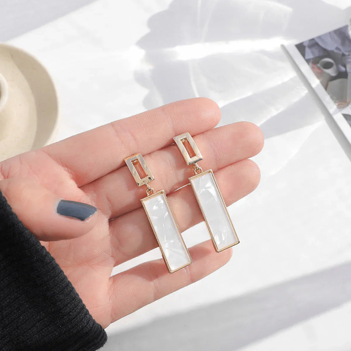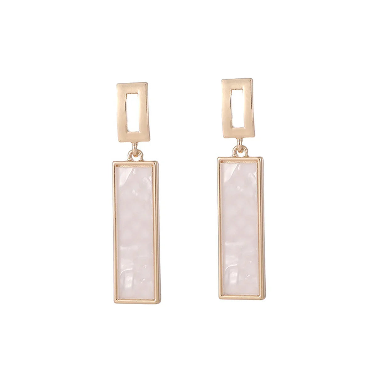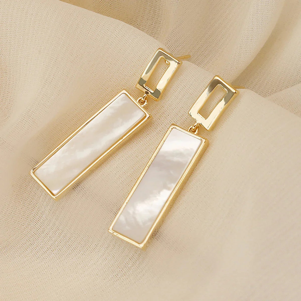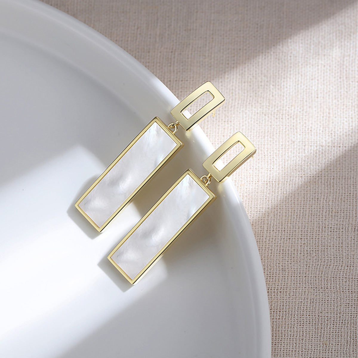 Exude timeless elegance with these stunning mother of pearl rectangle drop earrings. Featuring a delicate gold frame, these dangle earrings add a touch of sophisticated shimmer to any ensemble. Shop now for understated luxury.