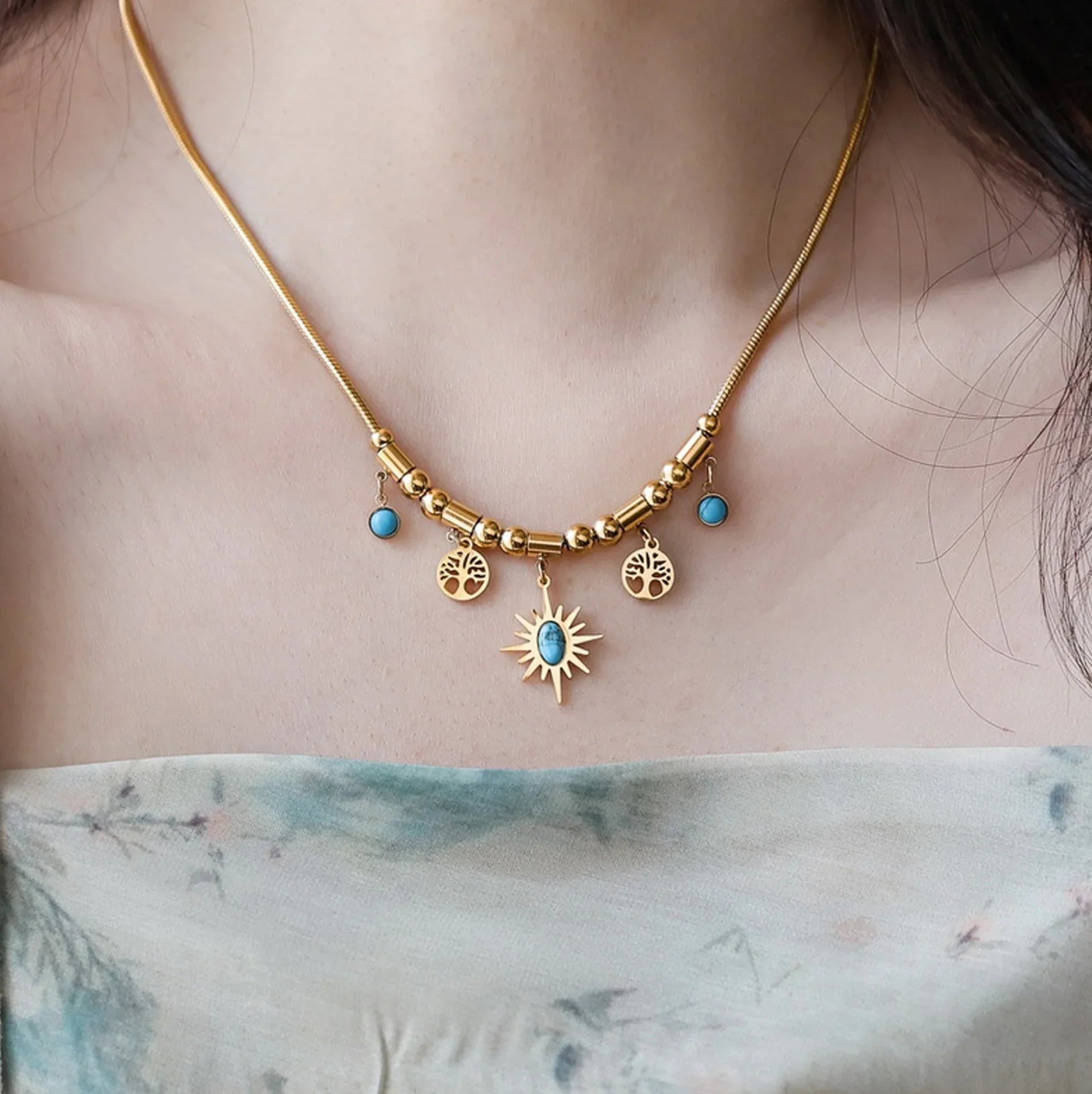 Add a touch of timeless elegance to your jewelry collection with this exquisite gold-plated necklace featuring a captivating combination of turquoise and symbolic charm elements. The centerpiece showcases a radiant sunburst design with a turquoise stone, flanked by two Tree of Life charms and delicate turquoise studs on either end. Crafted with precision, the necklace blends spiritual symbolism with modern aesthetics, making it a perfect accessory for casual wear, special occasions, or thoughtful gifting. The smooth snake chain ensures comfort and durability, while the high-polish finish gives it a luxurious shine. Embrace beauty, balance, and meaningful design with this versatile statement piece.