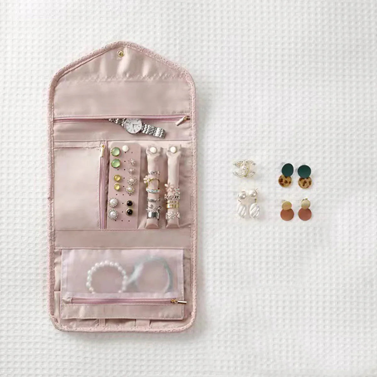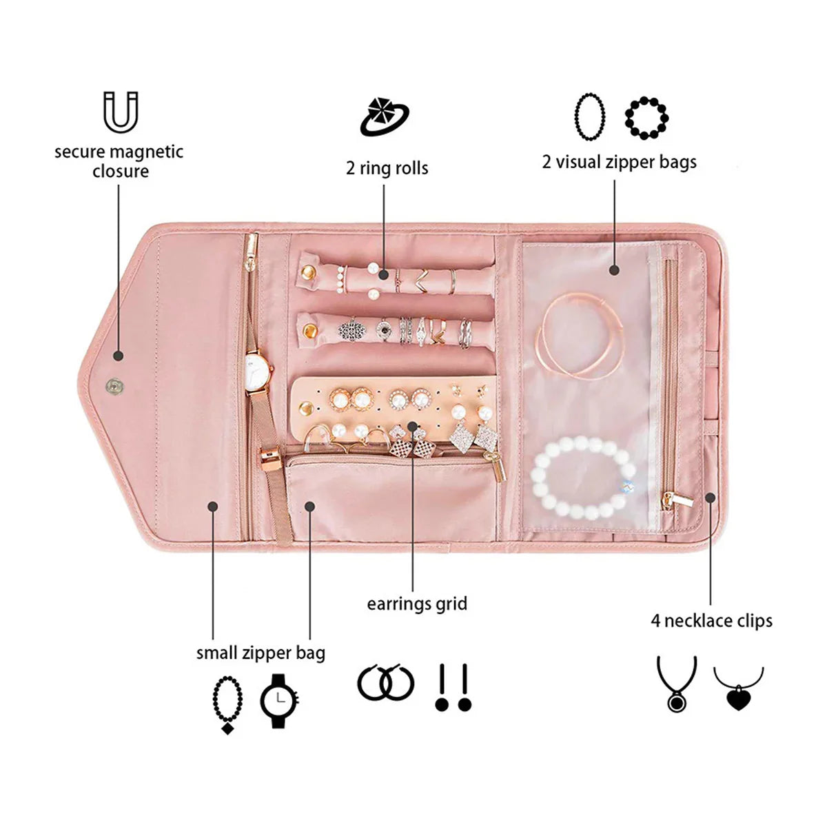HIGH CAPACITY: 2 rows with snap to store your rings, A detachable earrings panel for 9 pairs earrings or eardrop, 1 small zipper pockets for your precious items, like bracelets, necklaces, watch, pendant, brooches and more, 4 necklace straps with snap.