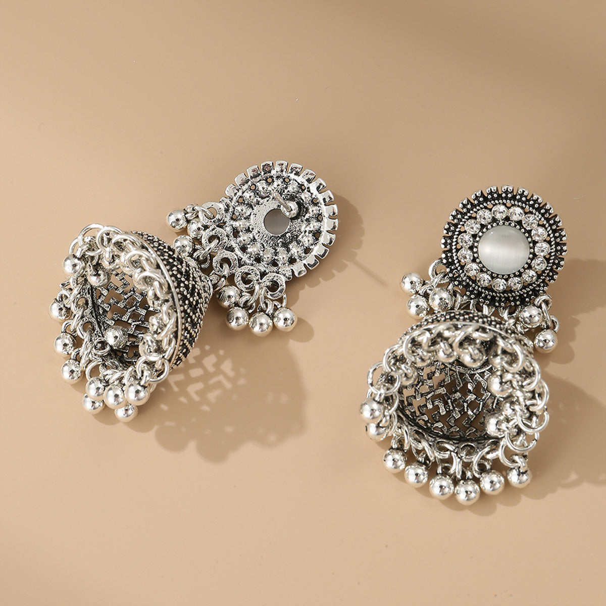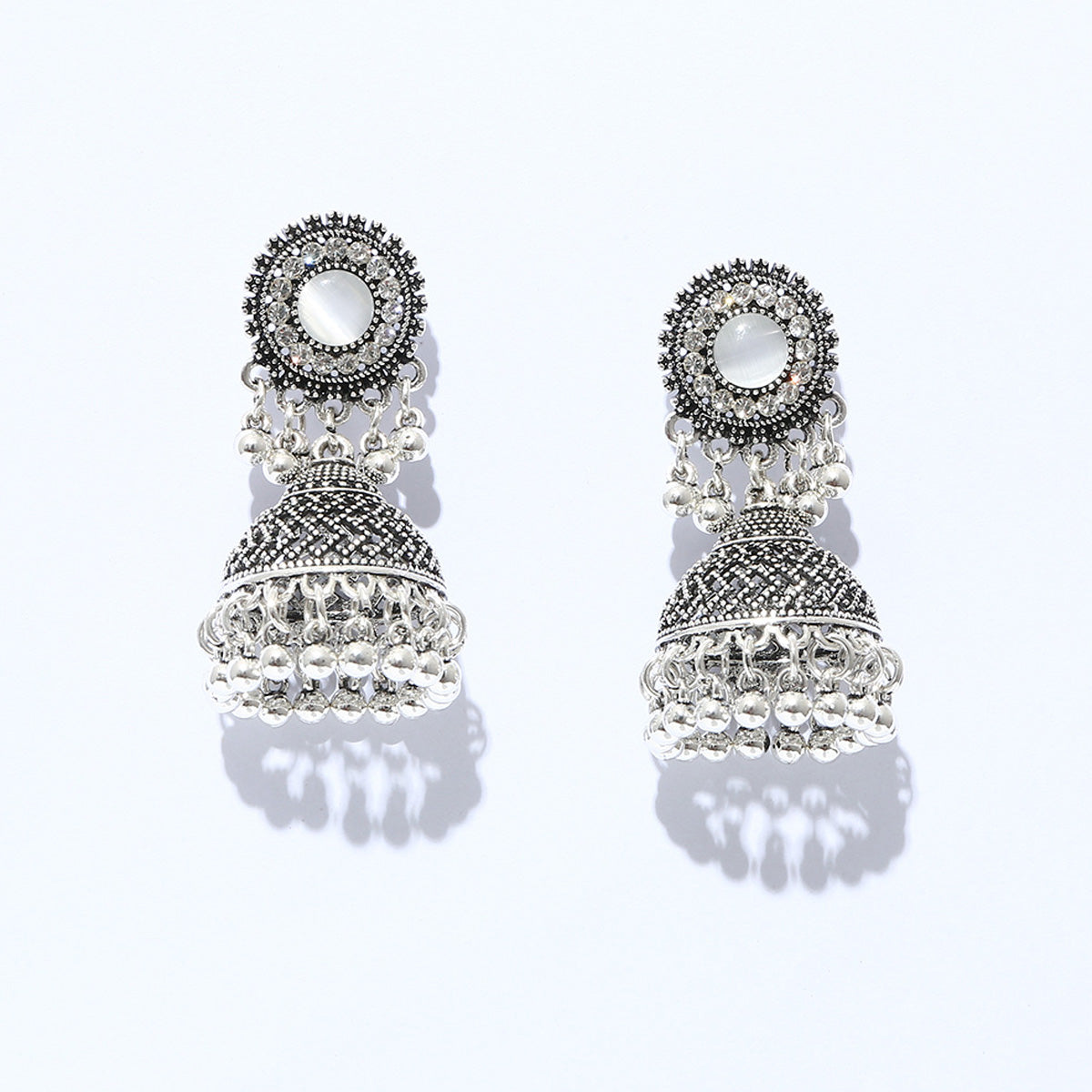 Dangle with dazzling grace in our stunning Silver Oxidized Jhumka Earrings. These ornate bell chandelier dangle earrings beautifully blend bohemian flair with vintage charm, making them a perfect statement piece for any occasion. Crafted with intricate details and delicate beadwork, they offer a touch of traditional elegance with a contemporary twist.