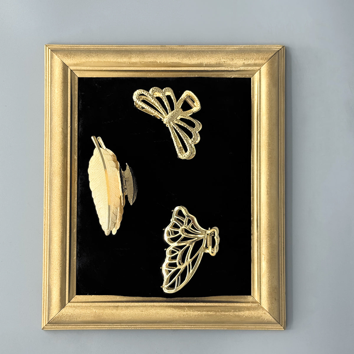 Discover effortless style and sophistication with this beautiful set of gold hair claw clips. Featuring intricate designs inspired by nature, including delicate butterflies and a graceful leaf, these metal hair clips are perfect for adding a touch of golden elegance to any hairstyle.