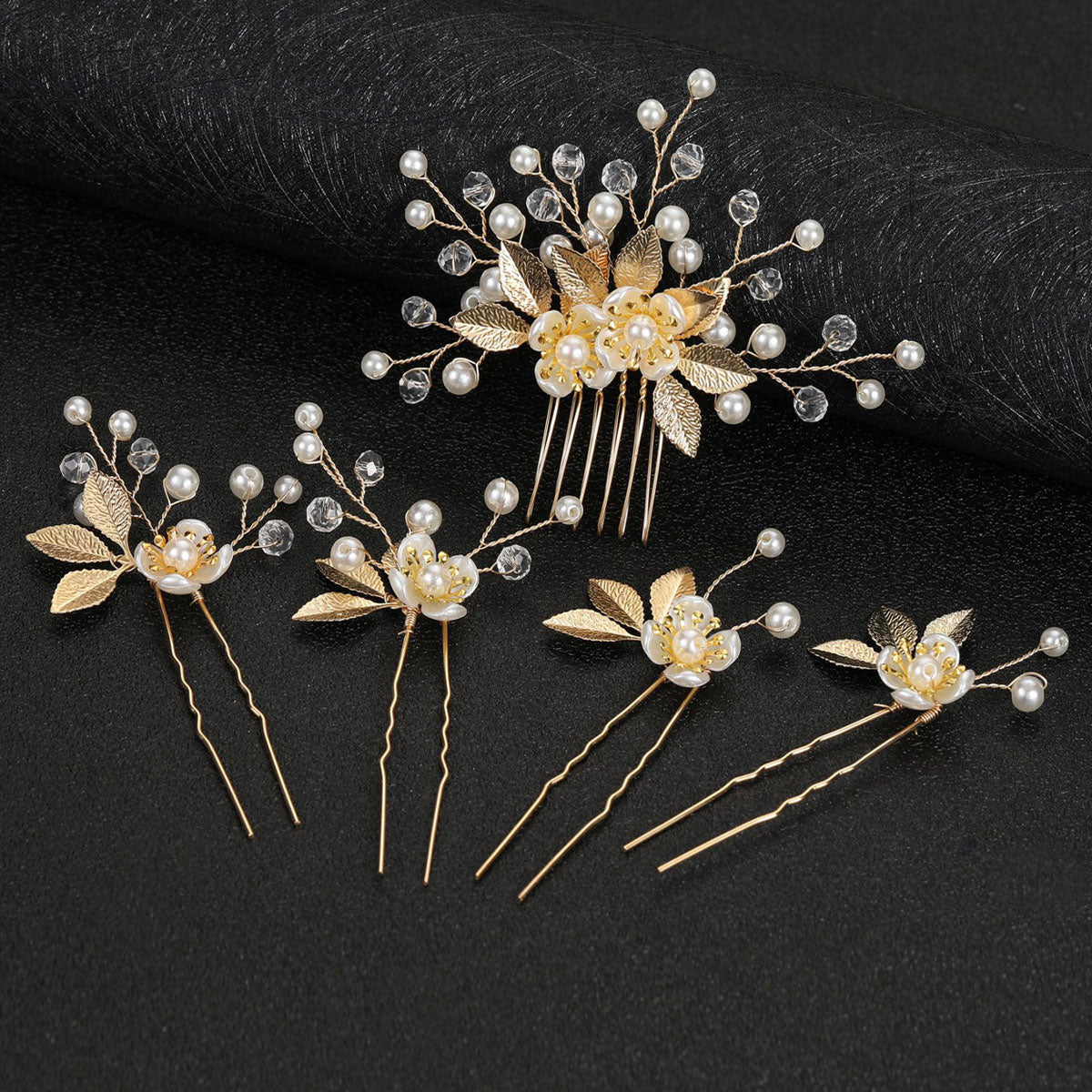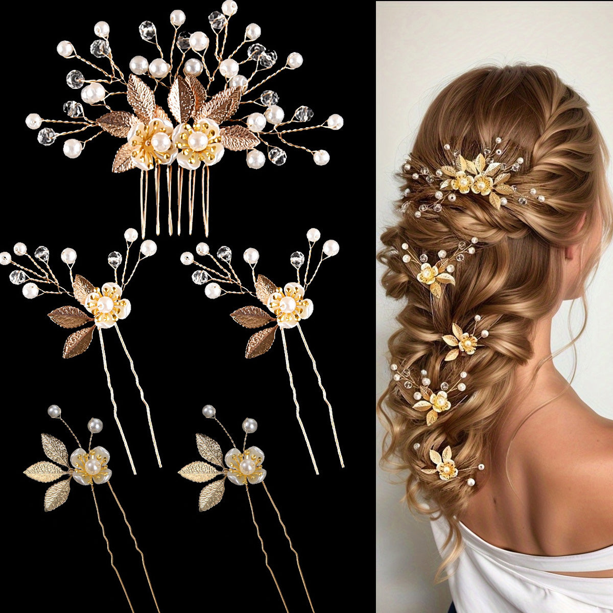 Add a touch of elegance and romance to your hairstyle with this stunning bridal hair accessory set, featuring a delicate combination of gold leaves, ivory pearls, and crystal accents. This 7-piece set includes one floral hair comb and six coordinating hair pins, perfect for creating dreamy bridal, bridesmaid, or prom hairstyles. Handcrafted with intricate detail, these versatile hairpieces are ideal for updos, braids, or half-up styles, offering a sophisticated and timeless look for weddings and special occasions. Lightweight and easy to secure, they complement both modern and vintage-inspired dresses.