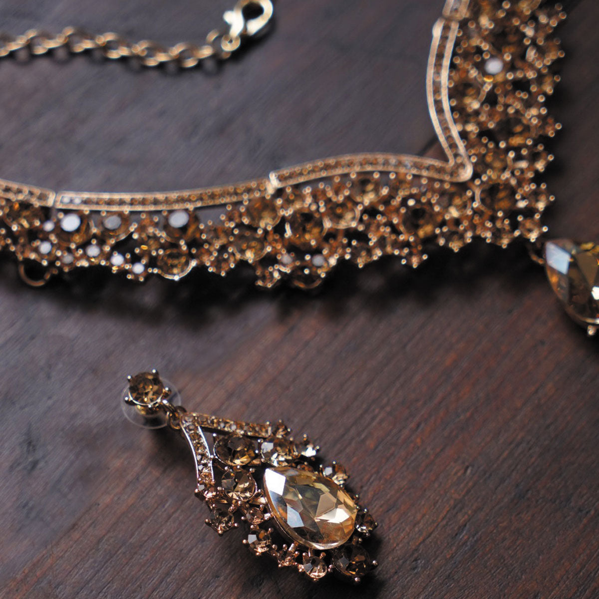Discover breathtaking allure with this magnificent necklace and earring set, designed to add a touch of opulent glamour to any ensemble. Featuring a captivating array of golden and amber-toned crystals meticulously set to create a striking statement necklace, complemented by perfectly matching drop earrings.