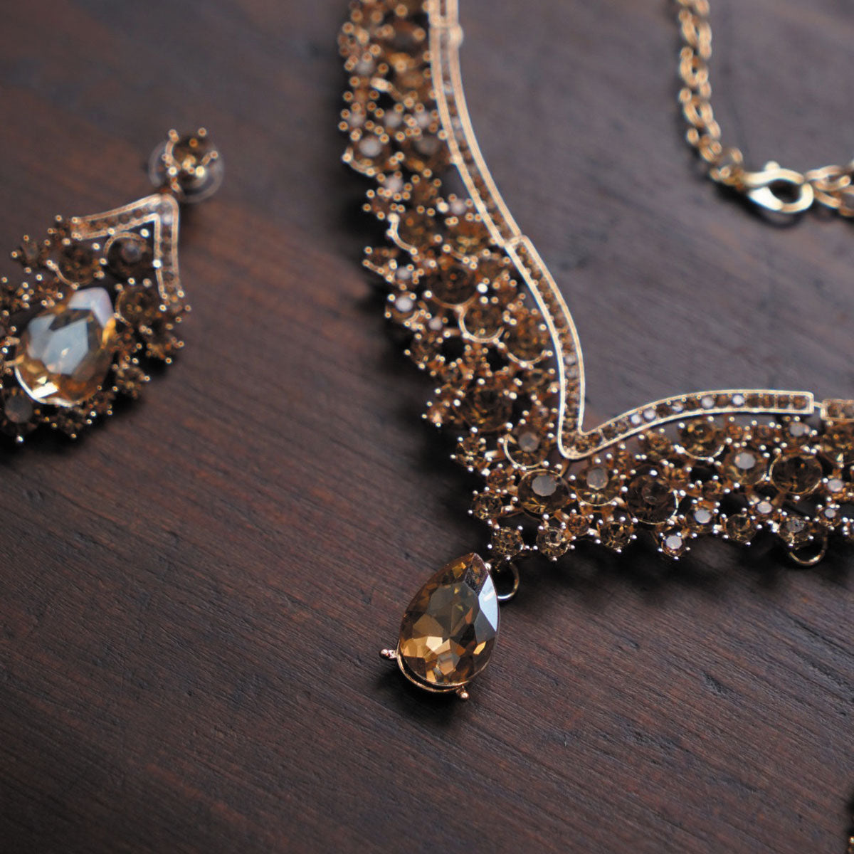 This exquisite set is ideal for special occasions, from weddings and formal events to anniversaries and festive celebrations. The rich, warm hues of the crystals exude sophistication and timeless beauty, ensuring you shine with every movement.