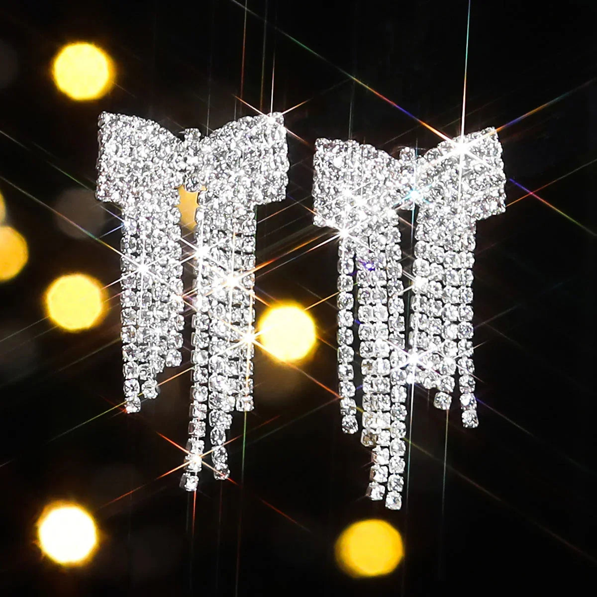 Elevate your style with these exquisite sparkling bow drop earrings. Featuring delicate crystal tassels, these elegant earrings add a touch of sophisticated glamour to any occasion. Shop now for timeless beauty.