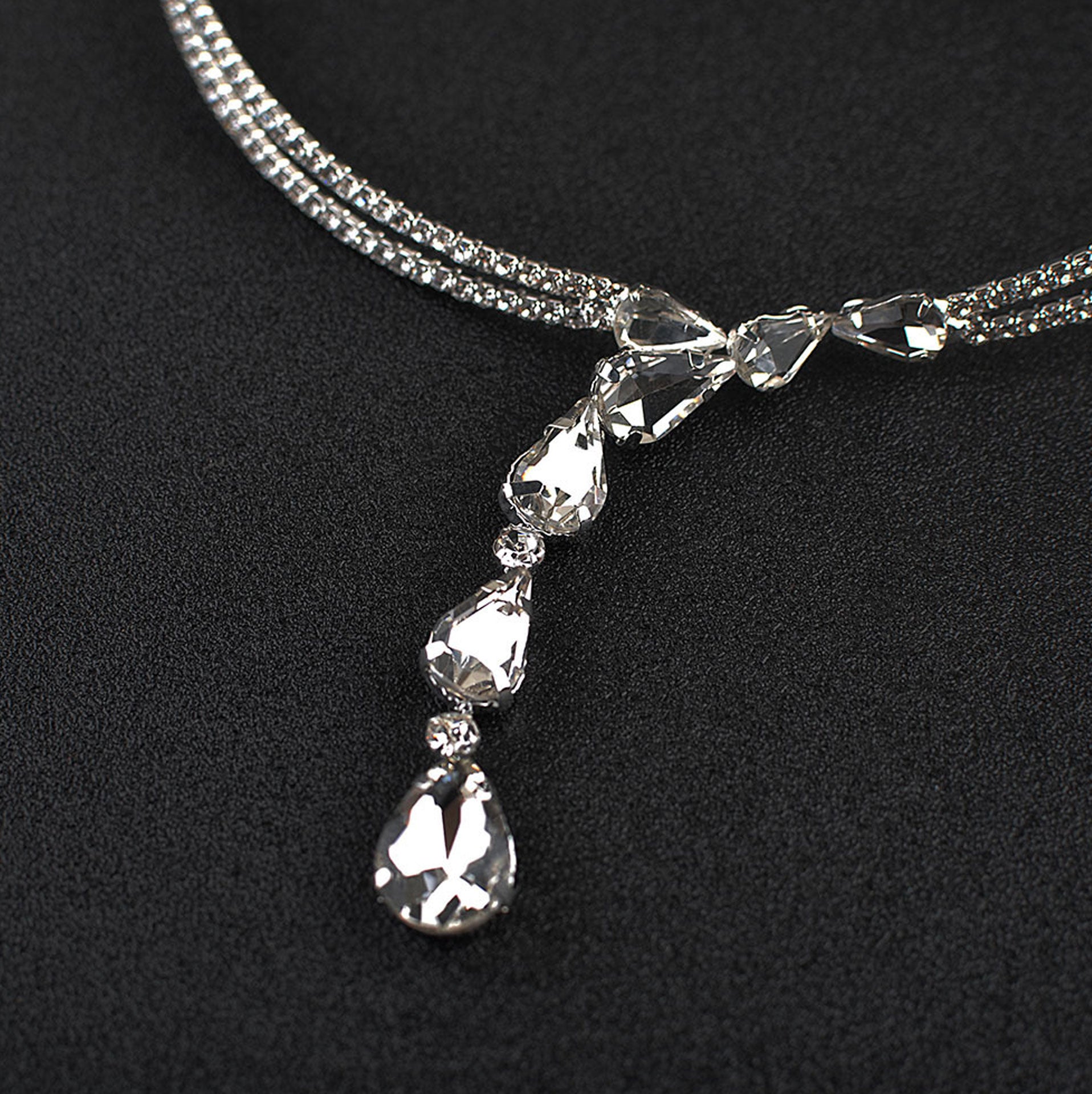 Add a touch of exquisite glamour with this sparkling rhinestone teardrop choker necklace. Featuring a delicate band fully encrusted with shimmering crystals and elegant teardrop pendants, this necklace will beautifully frame the neckline. Perfect for adding a touch of sophistication and sparkle to any special occasion or evening ensemble.
