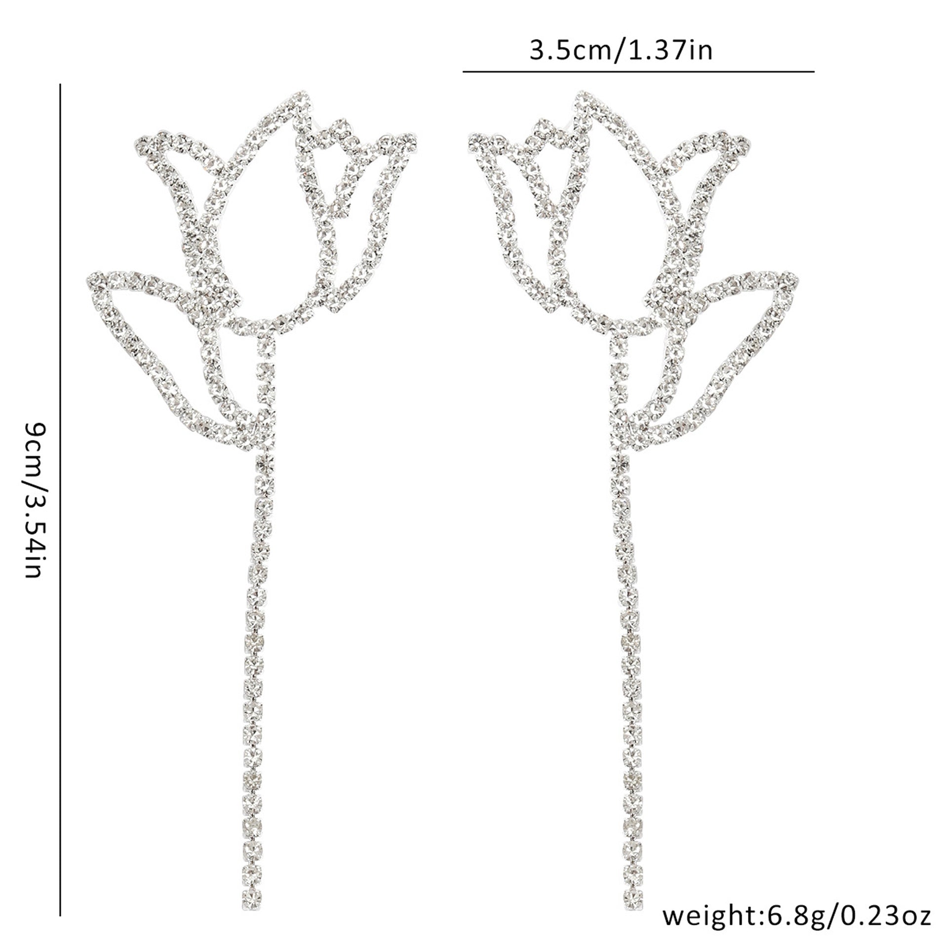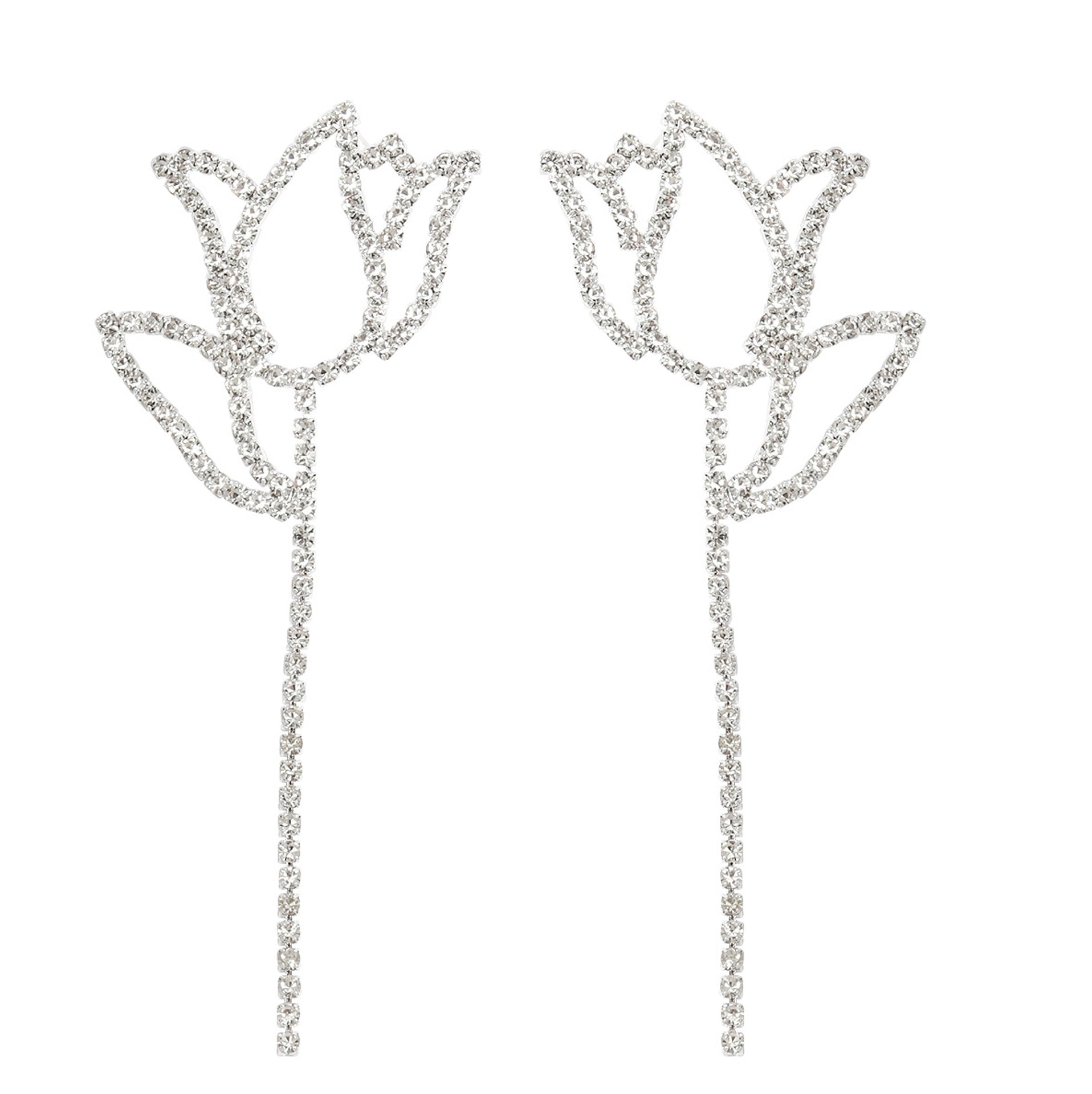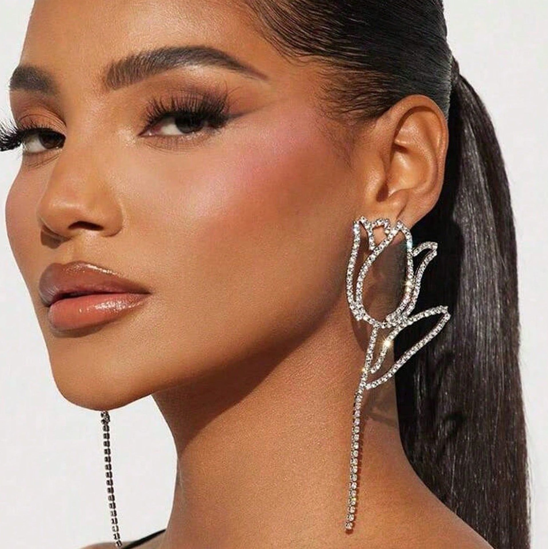 Add a touch of dazzling glamour with these sparkling rhinestone tulip drop earrings. Featuring delicate tulip outlines fully encrusted with shimmering rhinestones, these dangle earrings catch the light beautifully. Perfect for adding a touch of floral elegance and sparkle to any special occasion or everyday look.