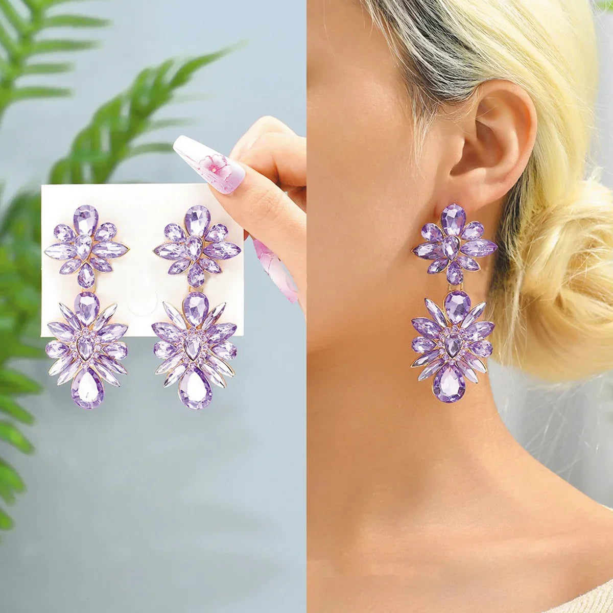 Each earring is meticulously crafted with high-quality, faceted crystals that catch the light from every angle, radiating a brilliant shine. The sophisticated lavender hue adds a pop of color that is both trendy and timeless, perfect for special occasions, parties, weddings, or a glamorous night out.