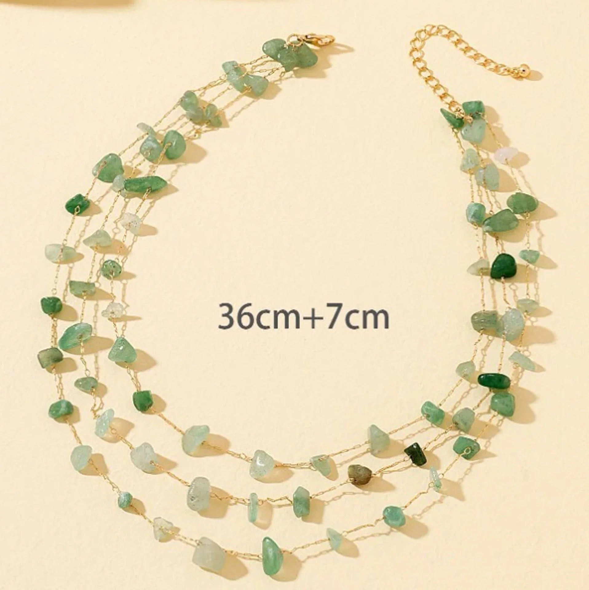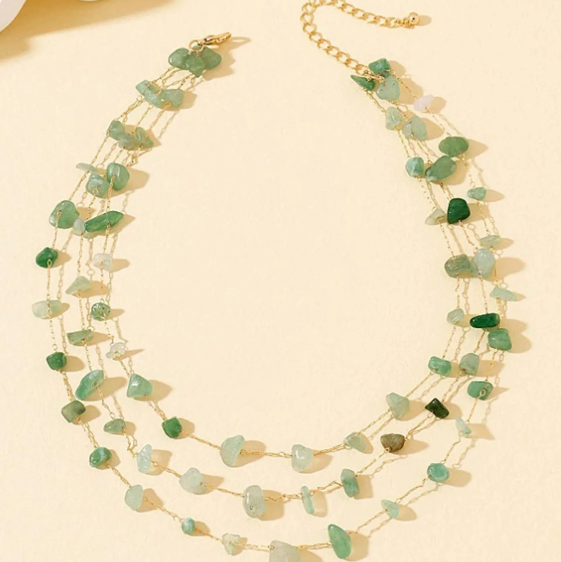 Embrace effortless elegance with this Triple Layer Green Aventurine Chip Stone Necklace. Designed with delicate strands of gold-toned wire, each layer features natural aventurine gemstone chips that radiate a calming green hue. This boho-chic necklace is perfect for layering or wearing solo for a subtle yet earthy statement. Whether you're styling a casual outfit or dressing up for an evening out, this nature-inspired piece adds a touch of grounded beauty and spiritual charm.